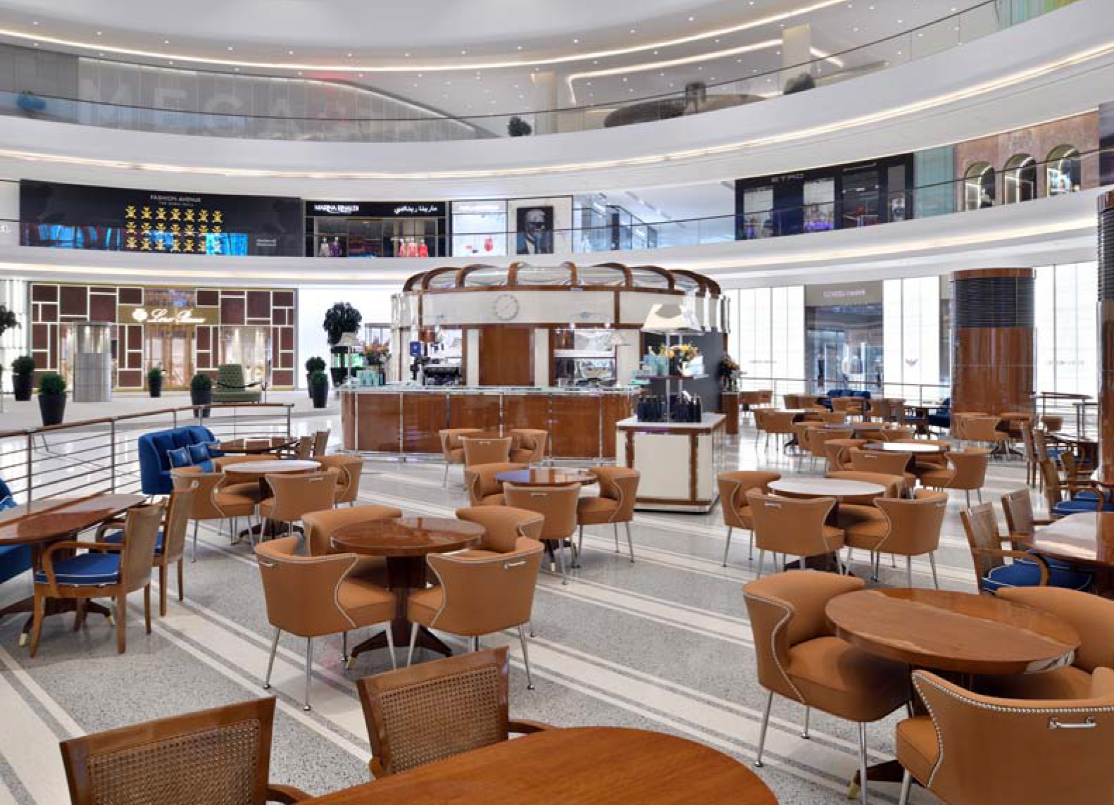 The design adds charm to the corridor linking Dubai Mall to the Fashion Avenue extension. Italian food and beverage culture and history. This follows through in the colour palette of the scheme with luxurious cream colouring of the ‘Panettone’ structure, walnut mahogany furniture, and terrazzo flooring. Among the highlights of the fitout works are the mahogany walnut furni ture, the bespoke terrazzo flooring and the final wall finishes of the ‘Panettone’.